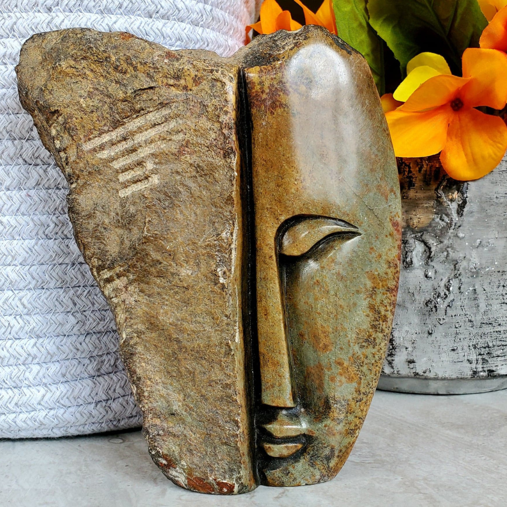 This Abstract Lady Sculpture is hand carved from warm brown serpentine stone by skilled Shona artisans in Zimbabwe. Featuring softly closed eyes an...