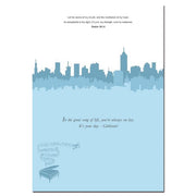 An African American Birthday Card adorned with an image of a man playing the piano on a rainy night. This stunning greeting card measures 5x7 inches and features full-color artwork on the inside and out and a high gloss finish. The sentiments inside of this greeting card read as shown below: