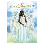 Our Hope, Joy and Peace Christmas Card depicts a strong, beautiful and loving African American angel adorned in flowing white attire. She stands with a lily in her hand that serves as a symbol of the Messiah Jesus, the Lily of the Valley and she gives reverence to the Heavenly Father above.. Inside the greeting card features a quote from the late Maya Angelou that reads:
