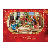 Our Merry Christmas Card features an image of an African American family eating and enjoying Christmas dinner. The inside of the greeting card features a scripture from Acts 16:31 and the following holiday sentiments: