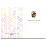 An African American Sympathy Card adorned with an image a woman praying. This stunning greeting card measures 5x7 inches and features full-color artwork on the inside and out and a high gloss finish. The sentiments inside of this greeting card read as shown below: