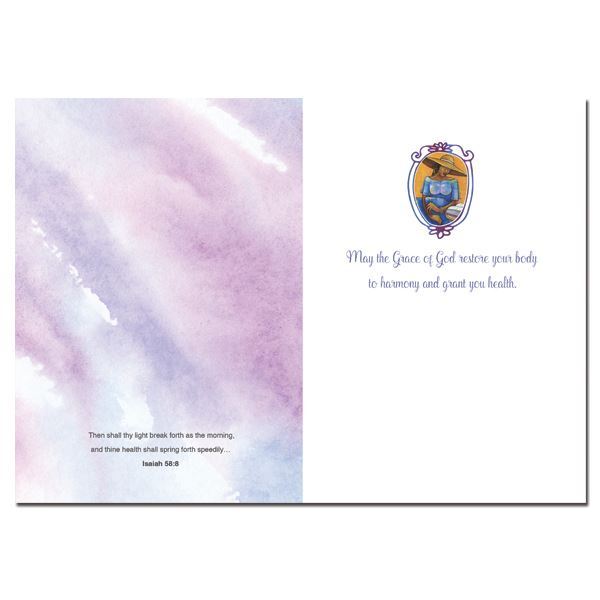 An African American Get Well Soon Card adorned with an image of beautiful lady. This stunning greeting card measures 5x7 inches and features full-color artwork on the inside and out and a high gloss finish. The sentiments inside of this greeting card read as shown below: